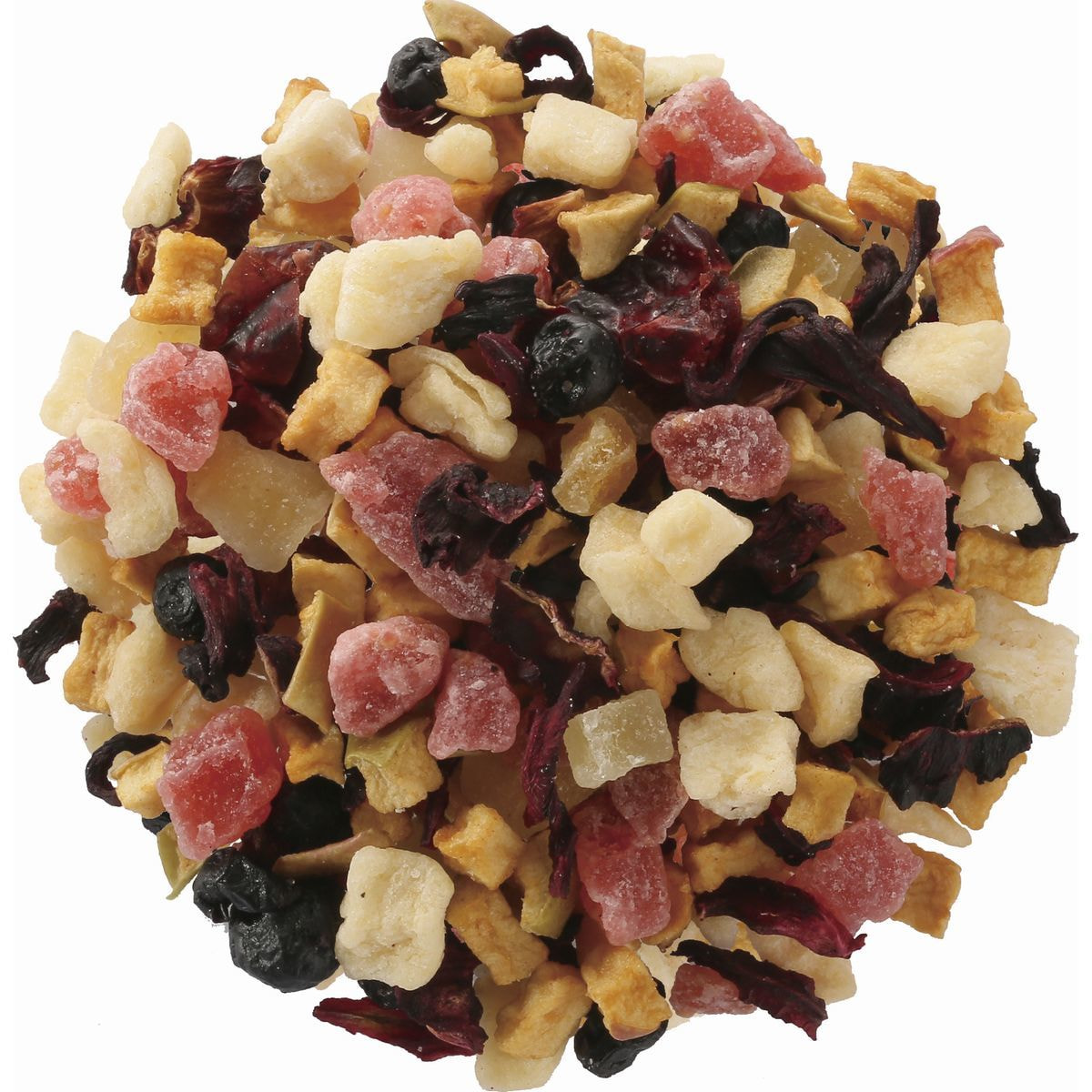 有機ドライアップル(オーストリア製造)、加糖ドライストロベリー、加糖ドライマンゴー、加糖ドライブルーベリー、加糖ドライクランベリー、有機ハイビスカス/香料、クエン酸、リンゴ酸、保存料(亜硫酸塩)、着色料(赤40)